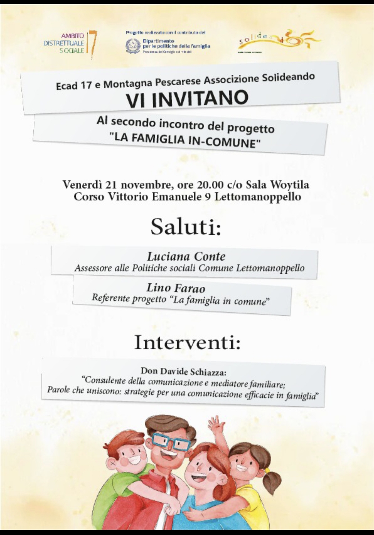 Invito 2° Incontro Progetto "La Famiglia in Comune" venerdì 21.11.2025 c/o Lettomanoppello C.so V. Emanuele, 9 - Sala WOYTILA.