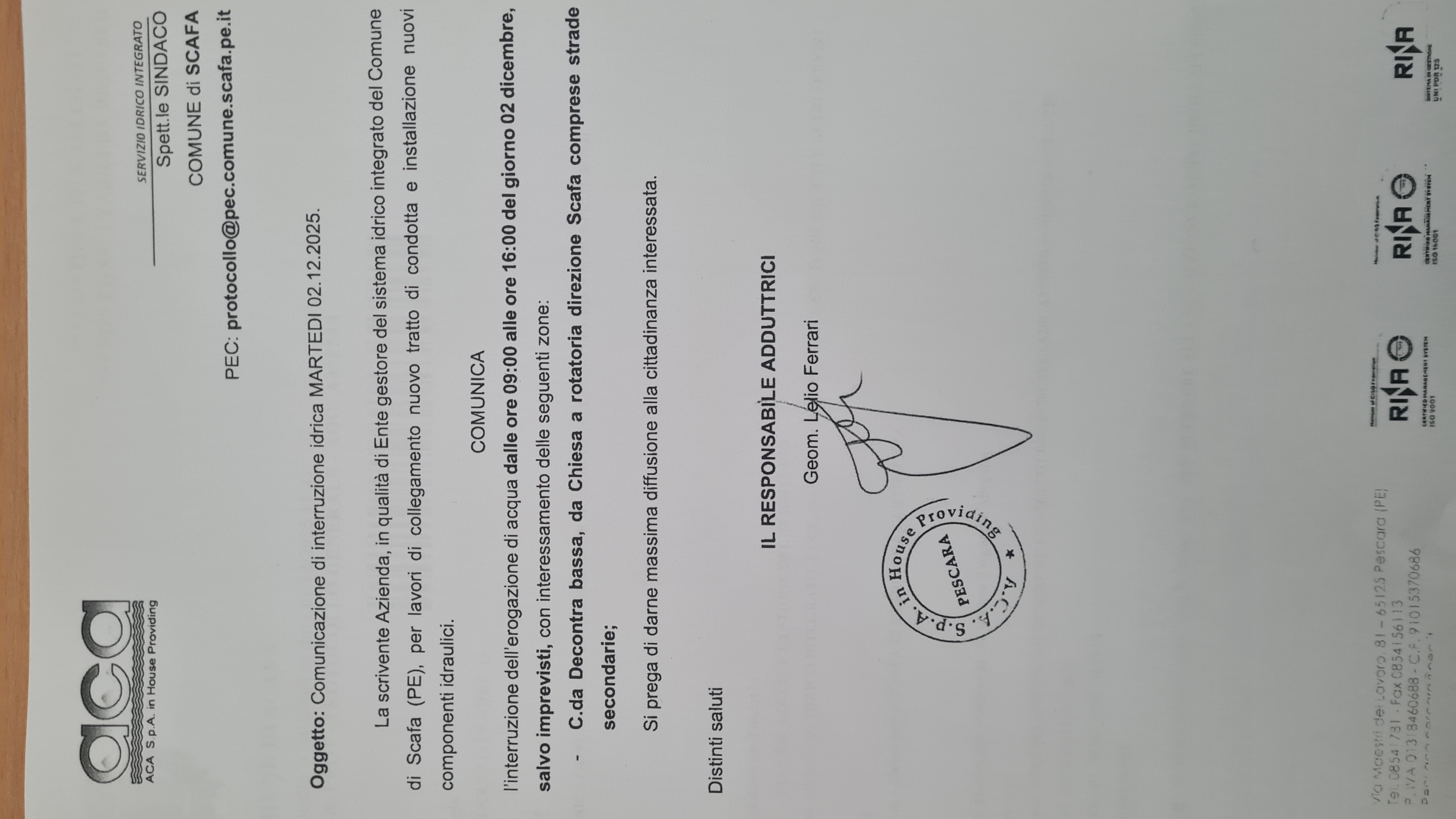 L'ACA comunica che dalle ore 09.00 alle ore 16.00 del 02-12-2025 in località Decontra, dalla Chiesa alla rotatoria direzione SCAFA, comprese le vie secondarie, ci sarà una interruzione dell'erogazione di acqua dovuta a lavori da eseguire sulla rete.